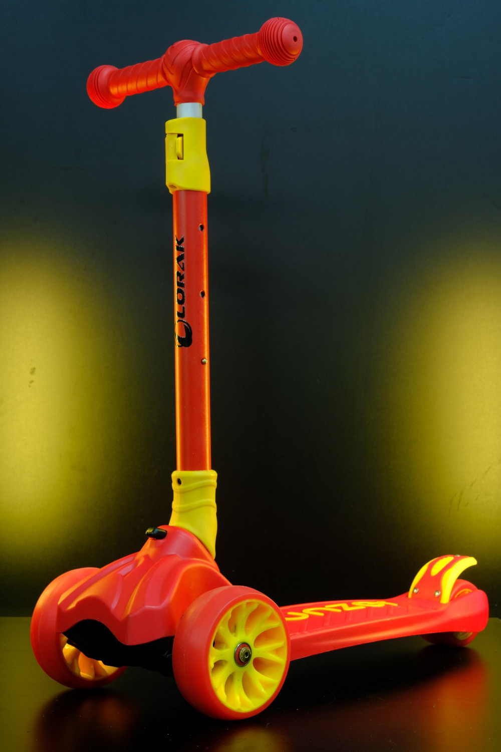 складной верхняя пластина из двухслойной стальной ленты нижняя пластина со светом и музыкой колеса Hummer flash из полиуретана заднее колесо из ПВХ размер колеса переднее 110mm заднее 45mm размер деки 420*130mm возраст 2+ вес 3.8кг цвет жёлто-оранжевый нагрузка макс 40кг